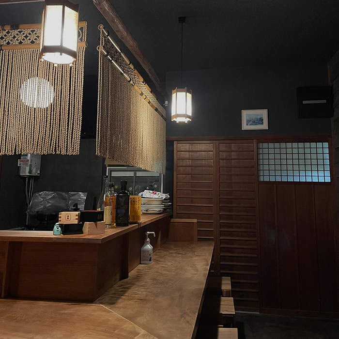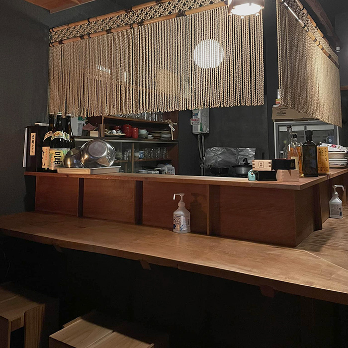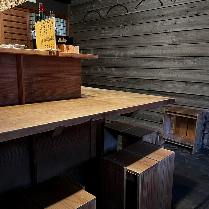 奥能登・珠洲の製材所や、大阪の古いお屋敷から譲り受けた部材で、純和風の趣を演出しています。とくに一枚板のカウンターが自慢です。そんな落ち着いた店内で、お楽しみください。